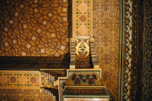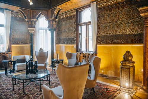 Az eklektikus épület csodásan felújított belterei közt olyan különlegességeket találunk, mint az arab architektúra által ihletett Arab-szoba (ma Mór-terem) és a kazettás mennyezetű Zodiákus-terem.